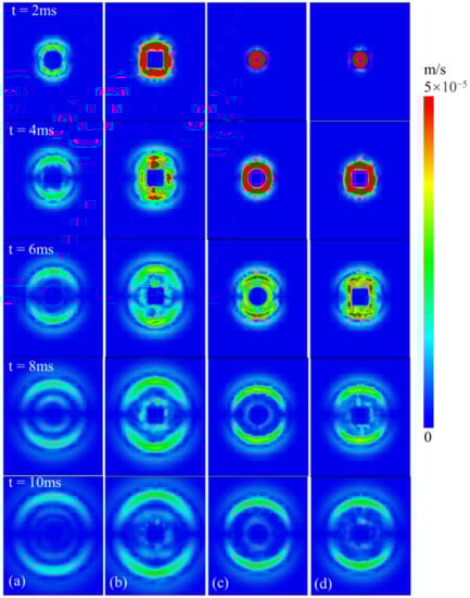 To explore the effect of rupture velocity on the PGV around the fault, the Cir(CR) seismic source with a source radius of 7.0 m is used as an example. Usually, the rupture velocity is compared with the rock shear-wave velocity. Sub-shear waves travel less than the shear-wave velocity; those waves more remarkable than the shear-wave velocity are called super shear waves. Shear-wave velocities of 0.6×, 0.8×, 1.0×, and 1.2× are used as the rupture velocity.