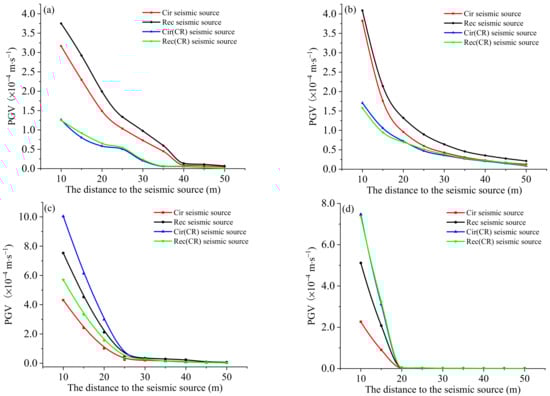 According to the typical fault-slip radiation pattern, the PGV of line L1 in the S-wave radiation area is generally higher than that of line L2 in the P-wave radiation area. However, in Figure 12a,b, the PGV in line L1 is lower than that in line L2 at 10 m from the seismic source. The reason for this is that there is a superposition area in the P-wave and S-wave radiation area on the L2 line near the source, resulting in the PGV on the L2 line near the source (10 m) being higher than that on the L1 line in the S-wave radiation area. Meanwhile, with the increased distance, the PGV on the L1 line of the same distance is significantly higher than that on the L2 line. When the rock masses are within 3~4 times (20~30 m) the radius of the source, the PGV of the Cir(CR) and Rec(CR) seismic source is higher than that of the Cir and Rec seismic source, which is mainly caused by the propagation of stress waves at the front of the fault rupture and the superposition of rupture effects.