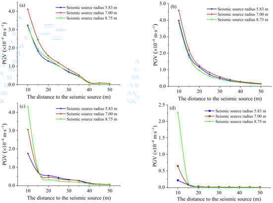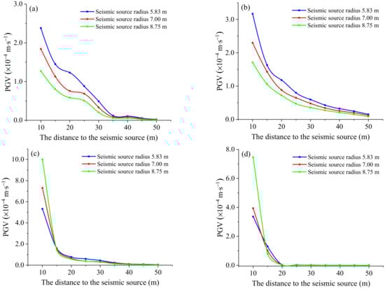 Effect of source radius on PGV under Cir seismic source: (a) L1 measurement line; (b) L2 measurement line; (c) L3 measurement line; and (d) L4 measurement line.
