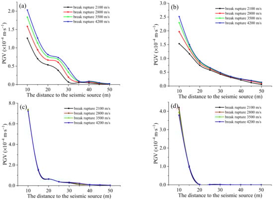 Effect of rupture velocity on PGV under Cir(CR) seismic source with a radius of 7.0 m: (a) L1 measurement line; (b) L2 measurement line; (c) L3 measurement line; and (d) L4 measurement line.