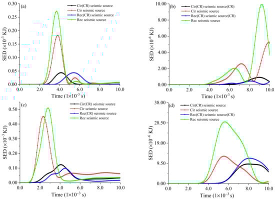 where ν is the Poisson ratio of the rock mass; E stands for Young’s modulus; and σ1, σ2, and σ3 represent the maximum principal stress, the intermediate principal stress, and the minimum principal stress, respectively. Ur is defined using the Fish function in 3DEC7.0 to obtain the change law of SED with time. Since the circular source has good transmission of stress waves, when analyzing the SED, the Cir and the Cir(CR) seismic sources are used for illustration.
