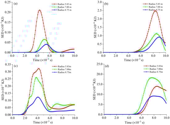 Similarly, taking a Cir seismic source as an example, we analyze the influence of source radius on SED. It is found that, under the exact seismic moment, the smaller the source radius, the greater the SED value in the process of stress wave propagation, while at the same distance from the source, the SED value on L2 is larger than that on L1, except for the SED varying the regularity of the far field (30 m) on line L2. With the increased distance from the seismic source, the SED value decreases in the order of magnitude, which can be compared via Figure 17a,b.