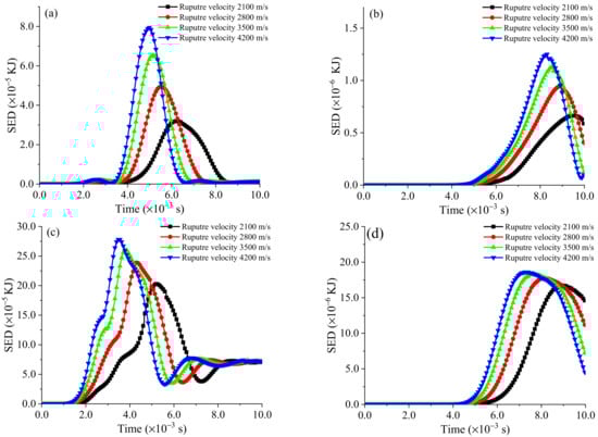 In addition, the effect of rupture velocity on the SED is also apparent, as shown in Figure 18. The faster the fault ruptures outwards, the more violent the change in the SED value of the rock mass. The trend of SED corresponds to the PGV; the more violent the ground motion, the greater the strain energy of the rock mass, reflecting the excellent regularity of the SED increasing with the increase in the rupture velocity. Since this paper simulates a small microseismic event, the SED is only 10−5 KJ in magnitude, and such small magnitudes do not threaten the stability of the rock mass. Although the peak SED values on lines L1 and L2 are positively correlated with the rupture velocity, with the end of the stress wave propagation, the final SED values are consistent. The influence of the rupture velocity on the SED gradually decreases along with the increased distance from the seismic source. It can be judged that the impact of the rupture velocity on the SED value is also limited in the far field. Therefore, in future applications, the effect of the rupture velocity on the dynamic response of the rock mass can be ignored in the far-field area. Taking a source radius of 7.0 m as an example, combined with the PGV analysis, in Figure 12b, the maximum curvature of the PGV is 25 m from the seismic source; that is, 3.6 times outside the seismic source, the rock mass can be considered to be in the far-field range.