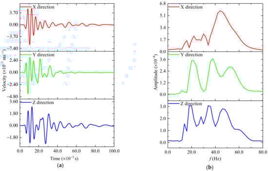 Simulated (a) microseismic signals and their (b) frequency spectrum. The red curve represents the seismic wave and frequency spectrum in X direction; the green curve represents the seismic wave and frequency spectrum in Y direction; and the blue curve represents the seismic wave and frequency spectrum in Z direction.