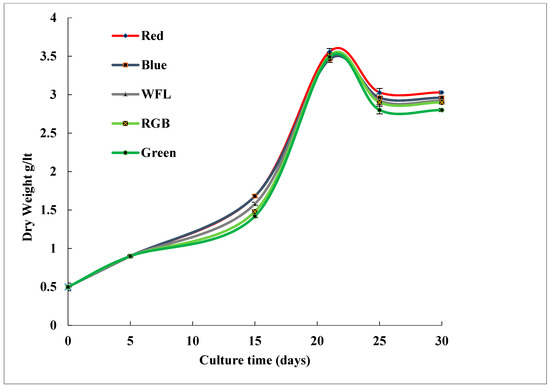 Time period for accumulation of biomass in shoot cultures of S. chirayita incubated under LED lighting. Experiment was conducted three times, and data were recorded as mean ± SD.