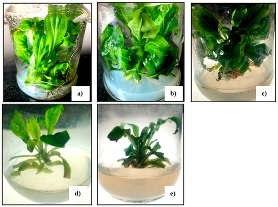 In vitro shoot cultures of S. chirayita incubated under LED lighting: (a) Red LED: Green and well developed shoots, (b) Blue LED: Green and compact shoots, (c) WFL: Green and compact shoots,(d) RGB: Less green and less compact shoots,(e) Green LED: Green and less compact shoots, small in size.