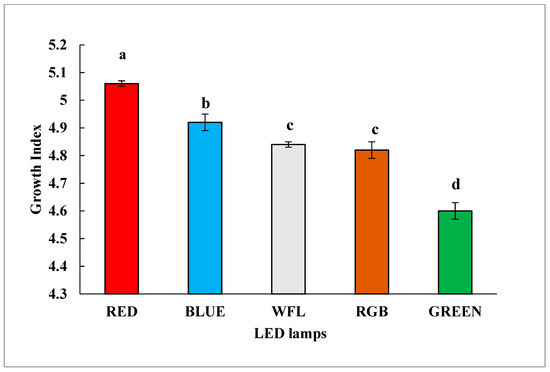 The present study revealed the impact of different LED lamps on growth in shoot cultures of S. chirayita. Similar growth kinetics in shoot cultures grown under various LED lamps are depicted in Figure 1. With a relevant variety of phases, the growth curve of shoot cultures incubated under various LED lamps showed a sigmoidal pattern for growth(lag phase: days 0–5, exponential phase: days 6–15, linear phase: days 16–21, deceleration phase: days 22–25 and stationary phase: days 25–30). Shoot cultures grown under different polychromatic LED lamps exhibited some variations in their morphology (Figure 2). Among various LED lamps, shoot cultures incubated under red LED showed maximum biomass accumulation (3.03 ± 0.01 g/lt DW) on day 21 of incubation. On day 30 of incubation, the maximum increase in the length of shoot and roots (6.13 ± 0.91 cm, 3.09 ± 1.33 cm, respectively) was observed in the red LED. An increase in the number of shoots and roots (5.51 ± 0.82, 1.94 ± 1.18, respectively) was also seen in shoot cultures incubated under red LED as compared with other LED lamps (Table 1). Growth index (GI) displayed the maximum accumulation in the red LED (5.06 ± 0.01) as compared with others and the control WFL (4.84 ± 0.01). However, the minimum accumulation was observed in shoots grown under green LED (4.60 ± 0.03) on day 30 of culture (Figure 3).