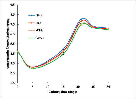 Upon completion at 30 days, the concentration of amarogentin in shoots culture incubated under various LED lamps ranged from 6.935 to 7.125 µg mg−1 DW. The maximum amount of amarogentin (7.125 ± 0.01 µg mg−1 DW) was quantified in shoot cultures incubated under blue LED in comparison with other lights, such as control WFL (6.945 ± 0.01 µg mg−1 DW). The minimum accumulation of amarogentin (6.935 ± 0.01 µg mg−1 DW) was quantified in shoot cultures incubated under green LED (Figure 4).