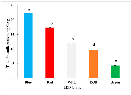 Phenolic compounds are ubiquitously present in plants and are of enormous importance due to their various biological defenses as antiproliferative agents, antioxidants, antimutagens, antiatherogenics and protectors against cardio disorders [45]. The main class of phenolic compounds that contribute to the scavenging of oxygen free radicals are flavonoids [46,47,48]. Phenolic compounds serve a diverse array of biological properties as well as health benefits [49,50,51,52]. Different types of light have been employed in earlier investigations to produce phenolics and flavonoids in tissue cultures [52,53], and numerous reports have examined the impact of polychromatic LED lights on the production of bioactive compounds as species-specific in plants [54].
