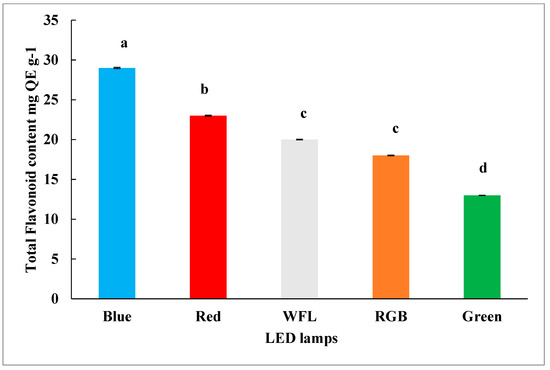 Impact of LED lighting on total flavonoid content in shoot cultures of S. chirayita after 30 days. Experiment was conducted three times, and data were recorded as mean ± SD, with a representing the highest, b representing the mild, c and d representing the least.
