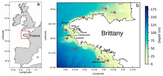 Located at the western extent of north-western Europe between the Celtic Sea and the Bay of Biscay, the surrounding seas of the Brittany Peninsula (Figure 1) are among the most energetic areas along the coast of France, with offshore significant wave height liable to exceed 10 m [21,28]. The continental shelf extends several hundred kilometres from the coast and shows, in nearshore areas, a highly variable bathymetry with a series of islands and emerged rocks. The coastline is also very irregular, evolving from coastal bays and basins to headlands and capes. This is particularly the case on the exposed western extent of Brittany, which includes, offshore, the island of Sein and the Ushant-Molène archipelago and, nearshore, the two prominent bays of Brest and Douarnenez, separated by the Crozon peninsula. This results in a highly variable exposure of coastal locations with shadow areas behind islands and increased wave energy off headlands [27,29]. These marine environments are furthermore characterised by strong tidal regimes with peak velocities expected to exceed 4 m s−1 near the sea surface within straits separating islands from the landmass [13,35,36]. Coastal seas around western Brittany show therefore strong interactions between tidal currents and waves leading, in particular, to pronounced currents-induced refraction with (i) changes of the wave direction towards areas with the lowest propagation speed of the crest and (ii) associated modulations of the significant wave height. In these environments, such effects resulted in modulations of the significant wave height liable to exceed 30% between high and low tides during storm conditions [15,37,38]. Further effects were naturally expected on the wave energy flux as a function of the squared significant wave height. Thus, it was suggested to include the effects of the tide (especially tidal currents) in numerical wave energy resource assessments conducted in western Brittany.