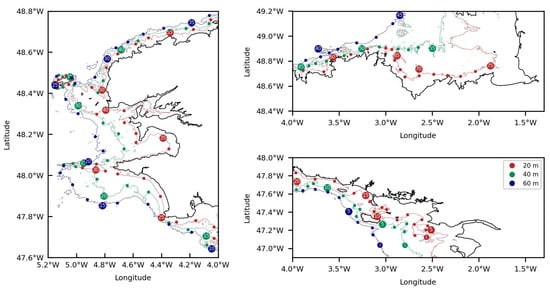 Locations of points retained, around Brittany, at water depths of 60, 40 and 20 m with respect to the lowest astronomical tides. Color lines show the isolines corresponding to these three water depths. Points were numbered with bigger circles every five points.