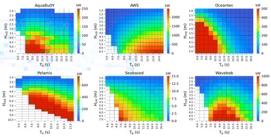 The different technologies of devices naturally impact the performances and the optimal range of energy conversion with respect to classes of significant wave height and wave period. They result in contrasting variations between WEC power matrices (Figure 3). Thus, AquabuOY, Seabased and Oceantec show higher electricity production for waves with reduced periods, typically below 10 s, whereas AWS and Wavebob tend to show higher performances for increased wave periods. This is especially the case for AWS, which reaches its rated power for wave energy periods greater than 13 s. Whereas Pelamis shows good performances over an extended range of wave periods, the device enters safety mode for high significant wave heights and low wave periods to guarantee the protection of the structure, thus restricting the energy extraction to a reduced power band. However, with the exceptions of AquabuOY and Oceantec, these different devices are characterised by higher performances for significant wave heights over 5.5 m, typically energetic conditions of offshore waters.