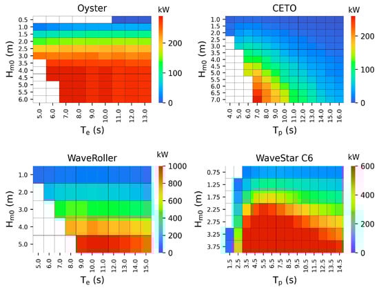 As for the other devices, power matrices exhibit varying responses to incoming waves conditions (Figure 5). Thus, in energetic sea states, Oyster and WaveRoller show higher performances for wave periods between 9 to 13 s whereas CETO is characterised by increased performances for restricted conditions with peak periods between 7 and 8 s. In comparison, WaveStar C6 reaches its rated power over an extended range of wave periods from 3 to 14 s. These WEC power systems operate furthermore for varying significant wave heights restricted to 4 m for WaveStar C6 and extended to more than 5 m for Oyster and CETO. On the one hand, increasing the range of Hm0 for power conversion clearly impacts the operating time of devices, thus extending wave conditions exploited to produce electricity. On the other hand, higher energetic wave conditions are required to reach the rated power, thus impacting the performance of devices, especially in nearshore waters where waves may experience significant energy dissipation by bottom friction [54]. For these reasons, a detailed investigation of WEC performances with a refined wave hindcast database is requested.