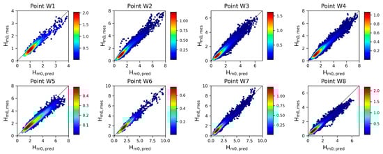 Correlation diagram for the evaluation of the significant wave height Hm0 at the eight wave buoys considered around Brittany. The colourbar refers to the probability density function based on a representation of a kernel density estimate using Gaussian kernels.
