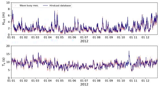 Thus, the wave hindcast database was assessed by focusing on predictions of the significant wave height Hm0 and the wave energy period Te at the eight measurement locations considered around Brittany. Following a series of advanced wave model evaluations [55,56,57], we considered (i) the mean absolute error