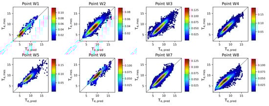 For the wave energy period, predictions also appeared consistent with observations (Figure 8). Unlike estimations of Hm0, however, there was not a clear tendency for over- or under-estimations of observed Te. At the eight locations considered, the normalised bias NBI was thus found to vary between −0.02 and 0.03. Nevertheless, we obtained reduced values of the symmetrically normalised root mean square error HH, below 0.12 at the eight wave buoys, which appeared consistent with predictions established in coastal waters [38,55,57]. Thus, Mentaschi et al. [57] obtained minimum HH indexes of 0.13 for approaching the observed mean wave period in the Mediterranean Sea. Similar minimum estimations were also obtained by Kalourazi et al. [55] in the Gulf of Mexico.