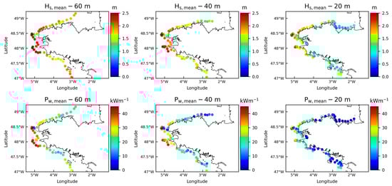 Spatial distribution of the averaged (top) significant wave height Hs,mean and (bottom) available wave energy flux Pw,mean over the 27-year period (1994–2020) at the locations considered in water depths of 60, 40 and 20 m around Brittany.
