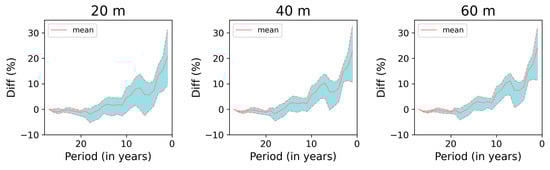 Relative differences in the estimation of Pmean,27, the mean available wave energy flux estimated over the 27-year period (1994–2020) with respect to the number of years n retained for these estimations. Thus, the relative difference is estimated at the different locations disseminated in water depths of 20, 40 and 60 m around Brittany as Diffn = (Pmean,n − Pmean,27)/Pmean,27 with n in [1,27] the number of years considered for this estimation and Pmean,n the mean available wave energy flux estimated from hindcast predictions over the n years between 2020-n + 1 and 2020. The dotted lines show the minimum and maximum values of Diffn computed in the three water depths while the continuous bold line shows the averaged values of Diffn.