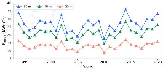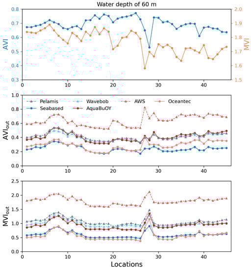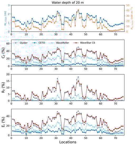 with Pout,year the mean annual wave power produced by the device over the time period considered (27 years in the present investigation), and Pout,A1 and Pout,A2 the mean annual wave power outputs for the years with the most and the least energy productions, respectively. Pout,M1 and Pout,M2 are, in the same way, the mean power outputs for the months with the highest and the lowest energy productions, respectively. In comparison with metrics AVI and MVI, these indexes were computed in the different locations with water depths of 60, 40 and 20 m for the thirteen WEC power systems considered; this was also the case for post-production metrics Cf, Rf and Ei.