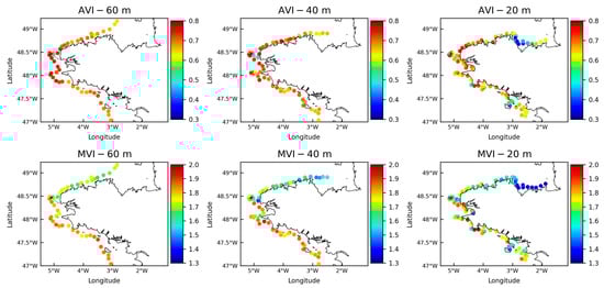 Spatial distribution of the energy metrics (top) AVI and (bottom) MVI at the locations considered in water depths of 60, 40 and 20 m around Brittany.