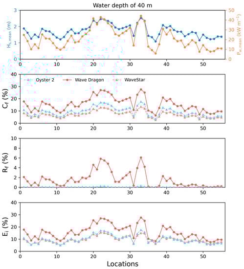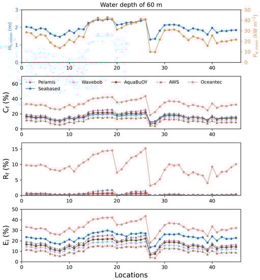 The performances of WEC power systems in water depths of 60, 40 and 20 m were successively investigated with respect to the spatial distributions of the capacity factor Cf, the rated capacity factor Rf and the efficiency index Ei. These distributions were placed towards the evolution of the averaged significant wave height Hs,mean and available wave energy flux Pw,mean shown in Figure 9, so as to identify the associated locations along the three isolines.