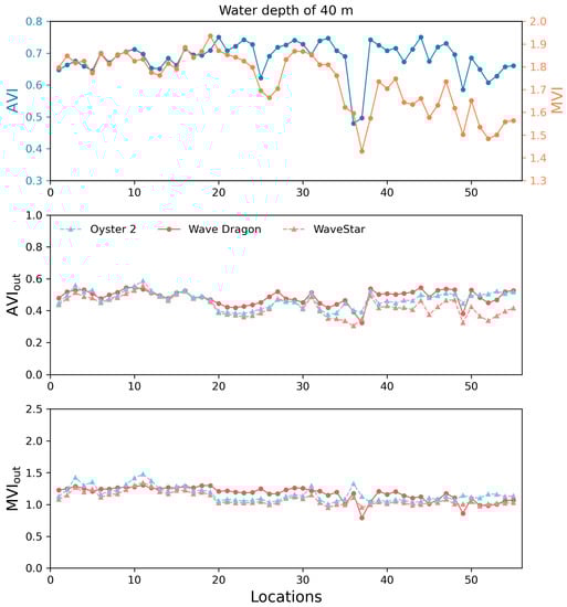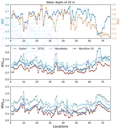 In intermediate waters (40 m), reduced differences were obtained between post-production metrics AVIout and MVIout, in spite of pronounced differences in WEC performances from Cf, Rf and Ei (Figure 14 and Figure 17). Furthermore, the results obtained exhibited the smoothing effect of energy production on the spatial distribution of these two pre-production metrics with variations in AVIout and MVIout restricted between 0.3 and 0.6 and between 0.9 and 1.6, respectively. The reduced differences obtained in temporal variabilities in energy output may also be explained by the wide range of wave periods for the operation of the three WECs extending from 7 to 14 s (Figure 4). As exhibited in the previous section, however, Wave Dragon showed increased performances as it was operating at its rated power over a wide range of significant wave heights including moderate storm conditions with Hm0 between 3.5 and 6.0 m.