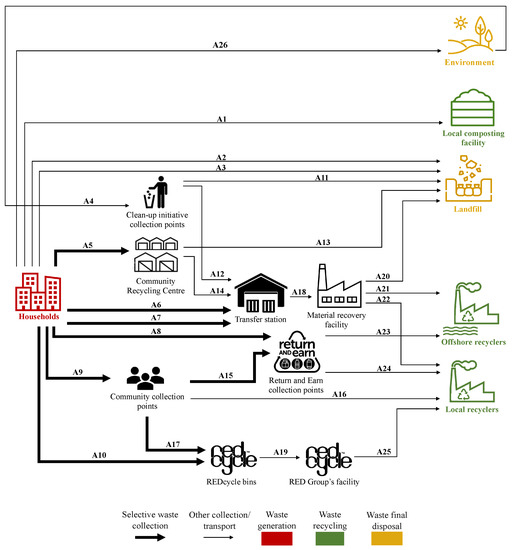 | A26 | - | - | Any | 133.40 | A26 shows the leakage of plastic waste into the natural environment. That is, plastic waste that ends up as litter in the marine and terrestrial ecosystem. To estimate the amount of plastic waste litter generated in Wollongong, the present study utilised the NSW Litter Report 2016–2020 [30] and the composition of the beverage containers supplied to NSW in 2018–2019 [31]. Part of the plastic waste which is leaked into the environment is collected by community-led environmental clean-up initiatives (see A4). |