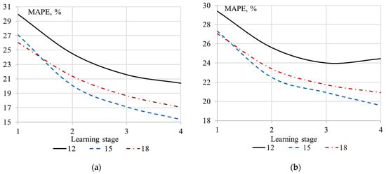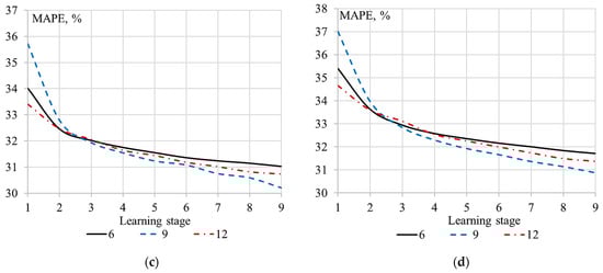 Simulation results with the detailed experimental procedure and obtained results are provided in Table 5 and Table 6. Similar experiments were executed for all activation functions, training methods, and the number of neurons and seasons. Table 5 shows that if the learning rate is too high (10−2), the process does not converge. The error does not decrease in the learning process. With a correctly selected rate (10−3), the accuracy quickly increases both on the training and validation sets. If the learning rate is too low (10−4), then the learning process is very slow, so the time to achieve acceptable accuracy is an order of magnitude longer than with a correctly chosen step. Table 6 demonstrates the effect of the number of neurons on the results of model learning. It can be seen that 15 is the optimal neuron number for the ReLU+Adam option. Since the data set is quite small, an increase in the number of neurons can lead to the identification of false dependencies. Figure 2 provides examples of the model learning process. For instance, it can be seen that when using ReLU+Adam, the number of neurons has a much stronger influence on the learning process than when using ReLU+SGD.