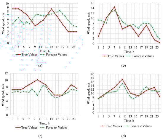 For considering the second option, when the model accepts data for all previous hours during the week, the best ReLU+Adam configuration was taken with a learning rate of 10−3, and the number of neurons was selected separately (Table 7). The obtained results show that this option is significantly inferior to the option when only the corresponding hours of the previous day are used for the forecast (the first option). It also indicates a very high variability of wind speed in the GBAO of the Republic of Tajikistan. The obtained results of the day ahead wind speed predictions are presented in Figure 3. It presents the variability of wind speed and shows that the forecast repeats the daily profile in general but in some hours the deviations can be very large.