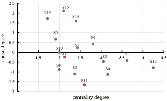 Note: S1-insufficient motivation for enterprise transformation; S2-imperfect supporting industry chain; S3-insufficient market demand; S4-high construction cost, low cost performance; S5-large upfront investment; S6-the prefabricated building management model is backward; S7-design standardization, modularization, and integrated systems are not perfect; S8-prefabricated building production, construction experience and technology are immature; S9-insufficient basic research and innovation of prefabricated buildings; S10-talent shortage; S11-low public awareness and willingness to buy; S12-low degree of social acceptance; S13-imperfect industry policy and standard system; S14-insufficient financial support; S15-insufficient government propaganda.