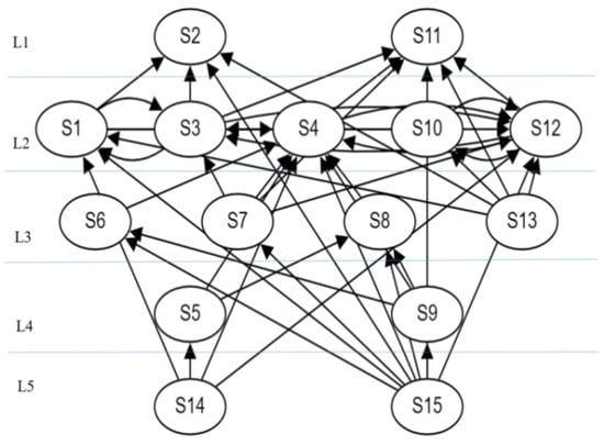 After solving reachable matrix R in step (9), reachable set P(Si) and antecedent set Q(Si) can be derived, P(Si) is the column set containing 1 in row i of R, and Q(Si) is rowset containing 1 in column i of R. When , 1st layer of factors can be obtained, and deleting this layer creates R1. In the same way, the ith layer of factors can be set up, and so on.