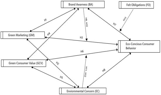 Concerning these influences, this study also focuses on exploring and understanding consumers’ feelings through felt obligation (FO). FO is defined as an individual’s cognitive and emotional perspectives, respectively [25]. Moreover, a sense of responsibility promotes more obligation and duty regarding ethical conduct in corporate environments [26]. FO has been intensively investigated in organizational behavior, examining the personal sense of responsibility and duties in existing workplace contexts [27,28]. However, some scholars have stated that FO may not directly influence ECB, asserting instead that being a responsible person may establish a substantial relationship between the mediating variable and the outcome.