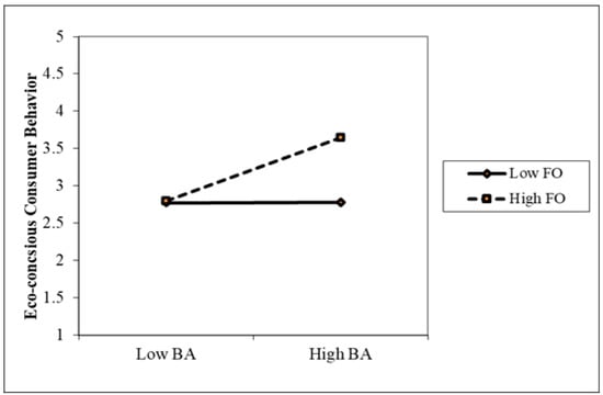 FO is a construct used to measure the degree of a person’s behavior regarding being responsible toward a situation [25]. Prior studies have found that FO influences affective commitment in the workplace [47]. The literature has also found that the BA of green products positively impacts ECB [24,26]. The consumers with more expressive intentions will benefit from increased brand recognition, which will positively affect their purchasing intentions [41,45]. Recommendations regarding environmentally friendly products act as an influencing factor that increases the likelihood of green purchases [27]. It is imperative, therefore, to ascertain whether FO moderates the relationship between BA and ECB to determine whether commitment regulates the association of BA with ECB. Hence, we hypothesize: