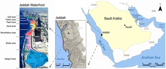 - Jeddah Municipality. Jeddah Waterfront. Available online: https://www.jeddah.gov.sa/Projects/RW/index.php (accessed on 18 January 2021).