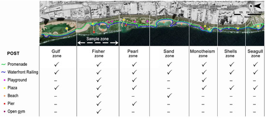 The researcher conducted an inventory of POSTs in JWP and identified seven prominent POSTs: playground (five counts), plaza (seven counts), piers (three counts), open gym (one count), promenade (one continuous), waterfront railing area (one continuous), and beach (four counts). Figure 2 shows the geographical distributions of those POSTs in the seven zones of JWP. The Fisher zone was found to include all prominent POSTs; thus, it was selected as the sample zone for this study (Figure 3). However, because the beaches in JWP were closed during the period of this study, the beach POST was excluded.