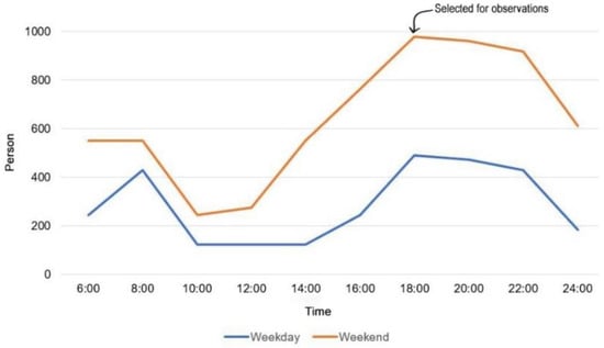 The researcher chose to carry out the investigations during the peak of visiting season, between November 2021 and February 2022 (average high temperature: 29.3 °C; average low temperature: 19.3 °C) [34]. The sample zone was monitored from morning to midnight during three weekdays and three weekends to identify the busiest time of the week in terms of the maximum number of users. As per these observations, the busiest time was found to be at six o’clock in the evening on weekends (Figure 4). This observation complies with the ”typical traffic” feature of Google Maps [35] (Figure 5). Thus, the researcher decided to perform the sample zone observations at this specific time.