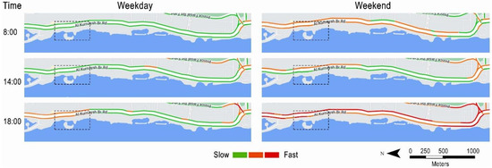 Typical traffic on Corniche Road at three selected times on weekdays and weekends. The sample zone is highlighted by a dashed rectangle.