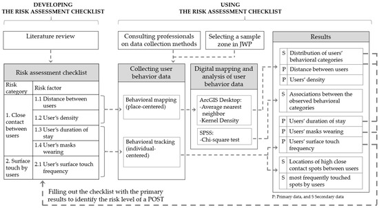 To collect data on user behavior in the six POSTs of the sample zone, two methods were used: behavioral mapping (place-centered) and behavioral tracking (individual-centered). The former was used to collect data for the checklist’s risk factors 1.1 and 1.2, respectively, whereas the latter was used to collect data for the risk factors 1.3, 1.4, and 2.1, respectively (Table 1).