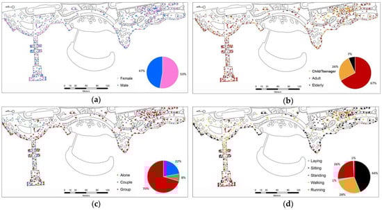 The collected data, using the behavioral mapping method, were transferred to ArcGIS for digital mapping and analysis. The results indicated that there were 978 observed users: the majority were females (53%), and adults (67%) who were in groups (70%) while walking (28%) and talking (59%). Figure 7 shows detailed data about the distribution of users’ behavioral categories in the sample zone.