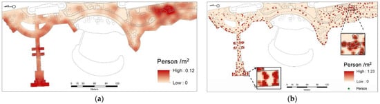 Moreover, the Kernel Density tool of ArcGIS identified the locations of hotspots (relatively high user density) in the sample zone. The two examined density plots were smoothed by 15 m and 2 m search radii. The 15 m search radius output (Figure 8a) highlighted the relatively highest density POSTs (playground, pier, and waterfront railing area). The 2 m search radius output (Figure 8b) highlighted the spots where the distance between users was <2 m. The mean distance between users and their spatial patterns at each POST was calculated (Table 3). Additionally, the average density of users at each POST was calculated (Table 4).