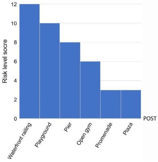 As seen in Figure 10, the potential risk of illness transmission was found to be varied from relatively high to relatively low at the waterfront railing area, playground, pier, open gym, plaza, and promenade, respectively. The high-risk scores with focusing on the relatively riskiest POSTs are discussed below.