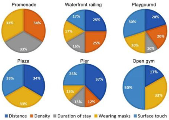 Finally, the potential risk levels of respiratory illness transmission in the six POSTs of the sample zone were identified using the developed checklist filled out with the data collected and analyzed (Table 9). The order of the POSTs (based on the risk level from highest to lowest): waterfront railing area, playground, pier, open gym, promenade, and plaza (Figure 10). Figure 11 shows the impact of each factor of the checklist on the risk score of the POST: