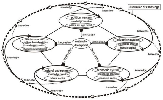 People, corporations, governments, and non-governmental organizations must commit to collaborate with various groups for development to be sustainable. One of the models that is both interdisciplinary and transdisciplinary is the quintuple helix innovation model, which is based on the quality management of efficient development, restoring harmony with nature, and maintaining Earth’s biological diversity [16]. The quintuple helix innovation model, which consists of five spiral frameworks that are the education system, economic system, political system, civil society, and the natural environment. QHIM suggests that the constant engagement of the entire disciplinary spectrum is necessary for a thorough analytical comprehension of all spirals. Each helix represents a knowledge subsystem that connects to the other systems in a spiral fashion and, in turn, has a local, regional, and global impact [16,17]. The QHIM can be described as a theoretical and practical model for the exchange of knowledge resources, based on the five social (societal) subsystems with capital at its disposal to generate and promote sustainable development of society—it is the pivoted force and driver for progress [18,19].