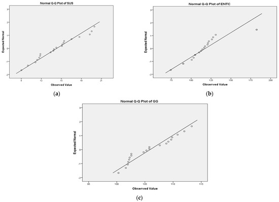Normal Q-Q plots for the variables: (a) sustainable development (SUS); (b) entrepreneurship (ENTC); (c) green growth (GG).