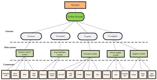 Decomposition of 3D printer into Functions–Systems–Components domain. The main functions are connected to the main systems. These systems are further decomposed into components.