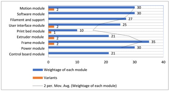 Five modules, along with weightage and variants in the 3D printer case, are shown in Figure 4. These variants include a motion module, extruder, print bed, frame and user interface.