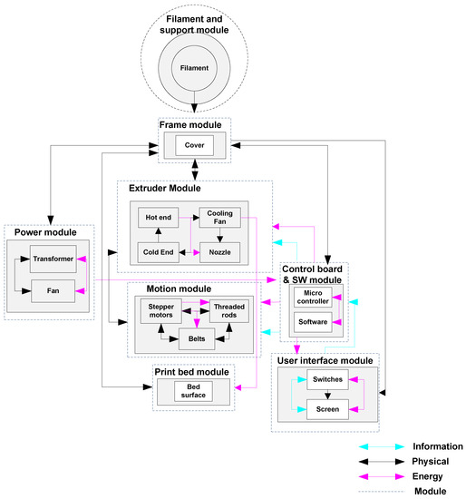 Product architecture refers to how a product’s functional parts are organized into physical units and how they interact [53]. The architecture of the 3D printer is developed based on the analysis (using system architecting and module indication matrix) by assembling the nine modules, as shown in Figure 5. The modular product structure assumes that the design changes and a number of variants should not be spread within the whole system but be confined to just a few modules. In this product, variants are introduced only in the nozzle, threaded rods, end stops, frame, build area, and user interface modules.