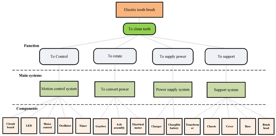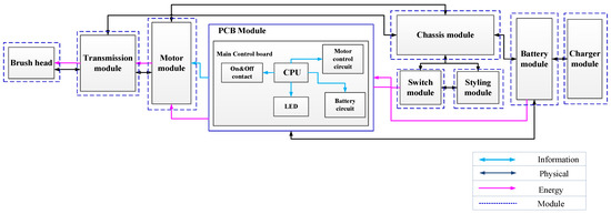 To develop modular architecture, Electric Brush is used as an illustrative example. Electric toothbrushes, a new form of a battery-powered toothbrush with an oscillating brush head, are becoming more popular. The main parts of the device are the battery pack, electrical motor, drive shaft, brush head, control card and charging unit.