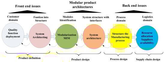 Modular product architectures enable mass customization by allowing a large range of goods to be built and assembled. Hence, modularity can be employed in goods (product architectural designs), manufacturing processes, and logistics (supply chain configuration) [9,10]. Product architectures that use standardized interfaces in both hardware and software allow for the effective implementation of mass customization and related manufacturing strategies [11]. It is worth noting that product architecture refers to how a product’s functional parts are organized into physical units and how they interact. A module is a physical or conceptual grouping of components, and modularity is the concept of breaking down a system into independent portions or modules that can be regarded as logical entities in both hardware and software [12].